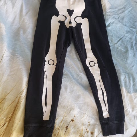 Pimeässä hohtava luurankoasu (paita ja housut) koko 122/128cm. Uusi, laput kiinni, jäi meillä käyttämättä. Ostin viime vuonna, mutta ei kelvannutkaan lapselle (maksoin itse tuon 14,99€, toivon saavani edes suurin piirtein maksamani takaisin).