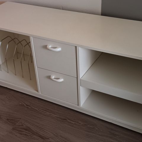 Vaalea tv-taso kahdella laatikolla ja neljällä hyllyllä.