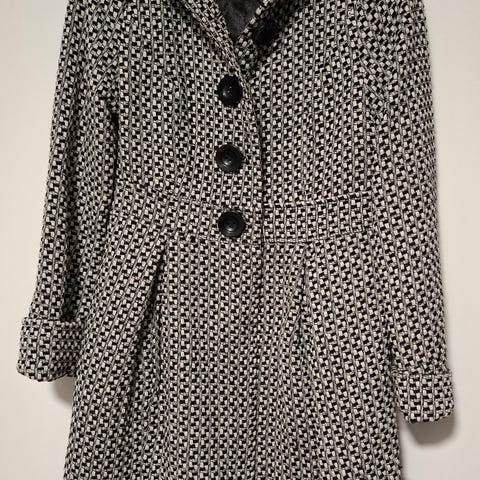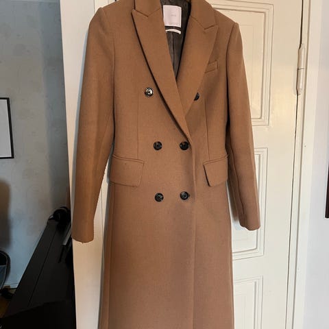 Vila pitkä takki ruskeassa värissä, naisten koko 34. Takissa on vyötäröllä solmittava vyö ja kaksirivinen nappi kiinnitys. (1 nappi vaatii uudelleen ompelua)
