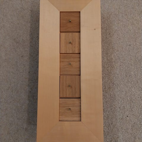 Pieni puinen laatikosto, jossa kaksi vetolaatikkoa. Laatikot erilliset, joten voi laittaa päällekkäin tai vieretysten. Yhden koko on 20 x 35 x 10 (l x p x k). Eli jos laittaa laatikot päällekkäin tulee leveydeksi 20 pituudeksi 35 ja korkeudeksi 20 cm.