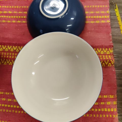 Neljä vihreää, pitkään käytössä ollutta kulhoa. Yhdessä pieni lohkeama.