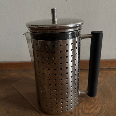 Vintage kahvipannu 1960 luvulta ja sen muotoilu on tyypillistä mid-centry modern- tyylille.Pannu on valmistettu lasista ja siinä on atomi-aiheinen tähtikuvio.