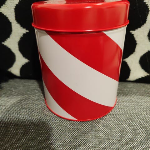 Aarikan vihreä, metallinen Pässit kedolla -peltipurkki, koko L. Purkkia ei ole käytetty.
