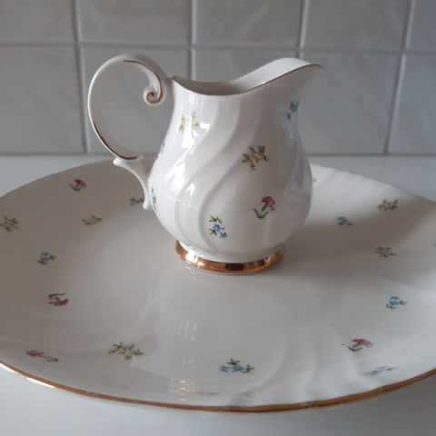 Arabia sokerikko ja kermakko, valmistettu posliinista. Tuotteissa on kukkakuviointi ja ne soveltuvat keittiövälineiksi tarjoiluun. Sarja sisältää sokerikon ja kermakon.
