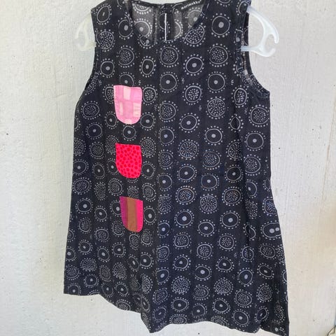 Hyväkuntoinen Marimekko Rekkomekko, 104cm. Ehjä ja puhdas, yhden pistemäisen tahran huomasin kuvatessa, kts. kuva 3.