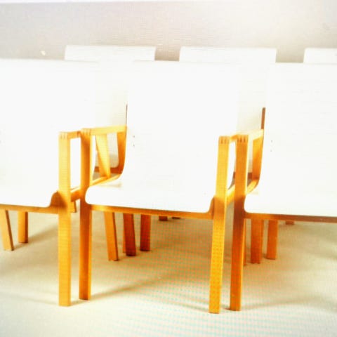 Tuoleissa käsinojat, päällystetty punotulla keinonahka.