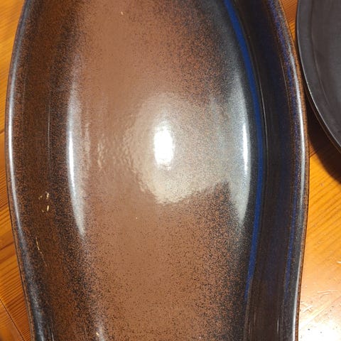 Uudenveroinen kalavati. Ei ole ollut käytössä. Kaksi pienempää uuniastiaa ja lautanen. Nämä olleet käytössä, mutta sen jälkiä ei näy. Bonuksena käyttämätön Markku-muki.