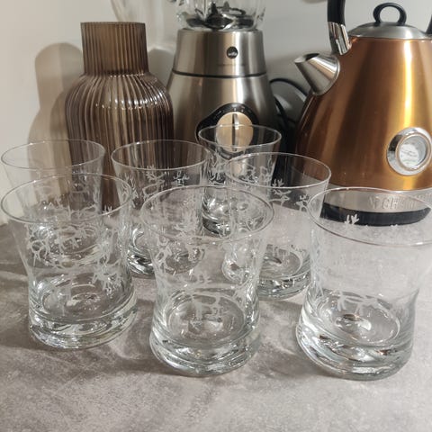 Pentikin Saaga-merkkiset, lasiset kuumajuomamukit, 2 kpl. Käyttämättömät, poistuneet tuotannosta.