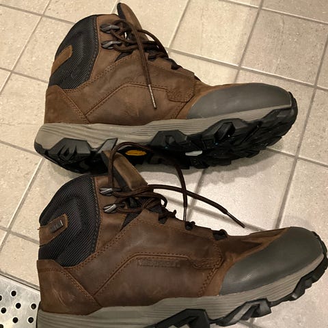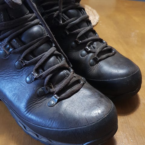 Vähäiselle käytölle jääneet jalkineet, kotona useita pareja vaelluskenkiä.