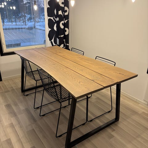 Kunnostettu 8 hengen lankkupöytä. Kansi on noin sata vuotta vanhaa puuta, jalat on puusepän vuonna 2020 valmistamat.