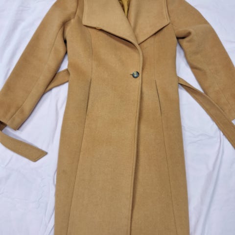 Hyväkuntoinen harmaa villakangastakki. Kainalo-kainalomitta 49cm, olka-helmapituus 88cm.