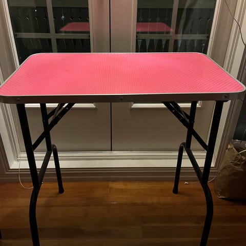 Koiran trimmauspöytä pyörillä,kokoontaittuva. Pöytälevy ,liukumaton pinnoite 115cm×60cm, korkeus maasta 66 cm. Säädettävä pidike,ruostetta aika paljon. Reunassa tarvii kiristää yhtä ruuvia.Pöytää käytetty nöffeillä ja mitteleillä. Maksu käteinen tai Mobilepay