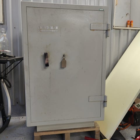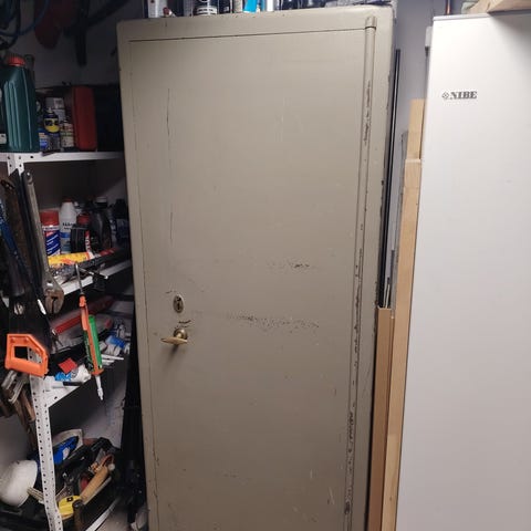 Huollettu ja maalattu joskus vuoden 2011 nurkilla, sittemmin saanut kuvien mukaisia käytönjälkiä. Ylä- ja alakarmiin tukeutuva 14 mm kaksoistappilukitus. Siirrettävät metallihyllyt. Kaksi avainta, alkuperäiskopio (Kassakaappi Oy, Helsinki) sekä työkaluteräksestä tehty omavalmiste. Tarkastettu ja hyväksytty aseiden säilytystilaksi vuonna 2013.