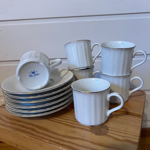 Hebei Porcelain kahvikuppisarja, valmistettu valkoisesta posliinista, jossa on kultareunus. Sarja sisältää useita kahvikuppeja ja lautasia, jotka soveltuvat tarjoiluun. Sarjan klassinen muotoilu ja materiaalivalinta tekevät siitä käyttökelpoisen erilaisissa kattauksissa. Isot lautaset on eriä merkkiä. Lautasia molempia 11kpl kahvikuppeja 9kpl. Kultareunuksissa kulumaan jälkiä. Ja yhdessä huomasin pienen lohkeaman.