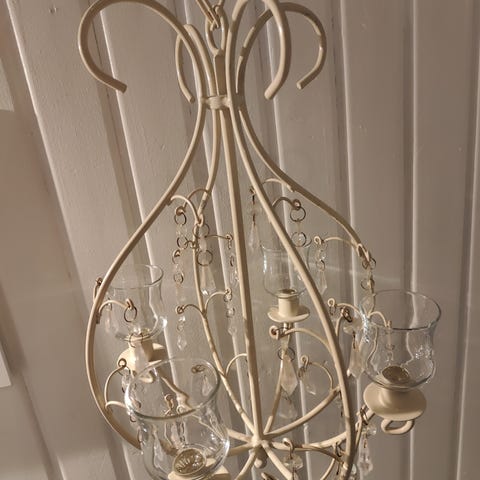 Kuvien mukainen metallinen kattokruunu, jossa on kuusi paikkaa kynttilöille. Korkeus 40 cm. Halkaisija 56 cm.Sopii sisäkäyttöön valaistuksen ja sisustuksen lisäämiseksi. 50 cm valkoinen ketju ripustamista varten mukana. Nouto ja käteinen. Tarvittaessa voin tuoda tuotteen kotiovelle pientä korvausta vastaan Tikkurilan (01300 postinumero) alueella.