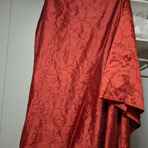 Punaiset verhot 4kpl mustilla lehtikuvioilla. Materiaali kevyt ja hieman läpikuultava. Siistit. Tankokuja yläreunassa. 230x110cm. Hinta kaikista yhteensä.