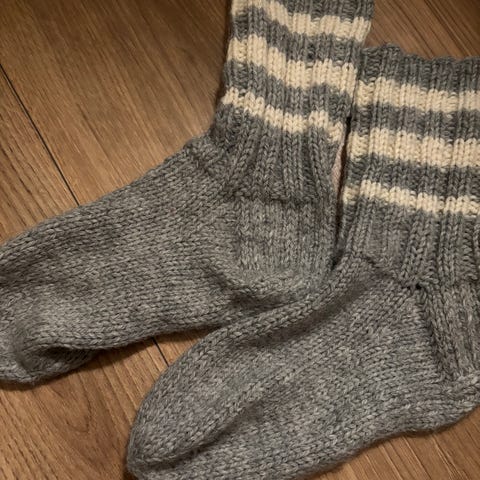 Harmaa, vihreä raidoitus, naisten M-koko villasukat. Nouto Kokkolasta. Useita malleja on muitakin. Kudottu seitsemän veljeksen langasta.