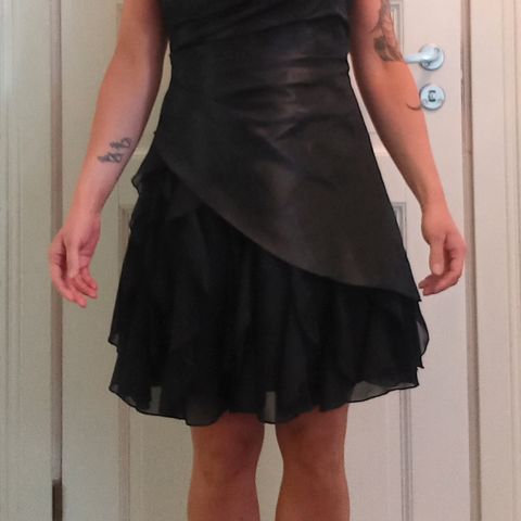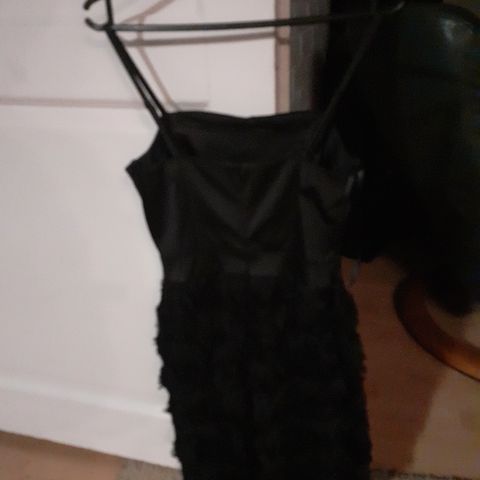 Pari kertaa käytetty musta mekko. Vyötäröllä kiristysnauhat. Tosi mukava päällä ja hieman joustava. Pituus olkapäästä helmaan n. 94 cm. Koko 36, mutta sopi itselleni myös M kokoisena.