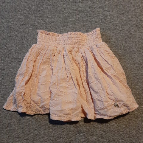 *Muhkea tyllihame kokoa 92/98 cm, väri persikka/ vaaleanpunainen. Kolme tyllikerrosta ja puuvillainen alushame. Kimalteleva kuminauhavyötärö. Hameessa on pari langanvetoa (kuva 6). Päällikerroksessa siististi paikattu reikä (kts. kuva). Yleisilmeltään hame on siisti, sillä korjattu kohta jää piiloon helman runsauteen.