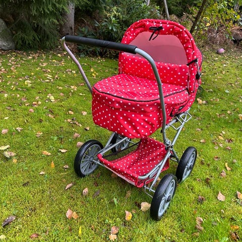 Tytölle leikkiin.Pituus kopasta kahvaan 75 cm, leveys 43 cm, korkeus koppaan