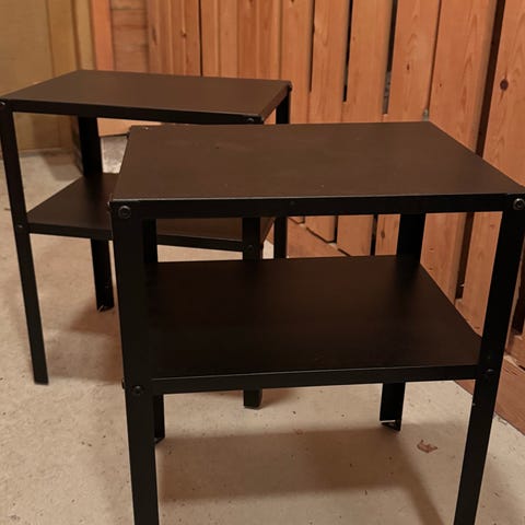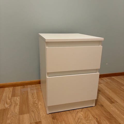 Ikean kuutionmallinen pyörillä kulkeva yöpöytä/sivupöytä. Vuorentausta. Koiratalous.