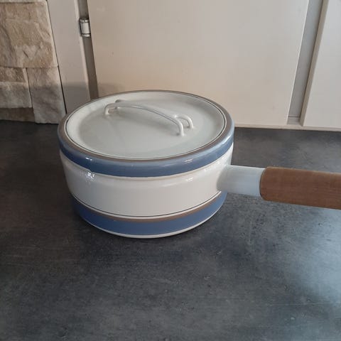 Hyväkuntoinen ja siisti kattila kork.9cm.halk.17,5cm. tilavuus. 2 L. teak varsi. Kannen toisella puolella emali vaurio.