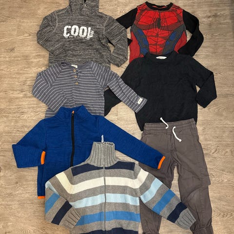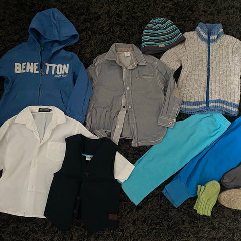 Pieni siistimpi vaatepaketti pikkutyypille. Sisältää kaksi neuleliiviä ja kahdet farkut.