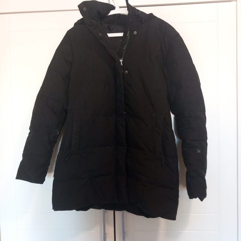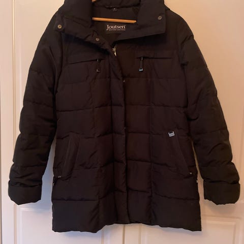 Muutamia vuosia käyttämättä ollut musta Joutsen takki joka on unohtunut vaatehuoneen perälle.