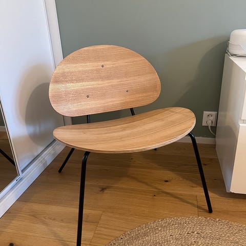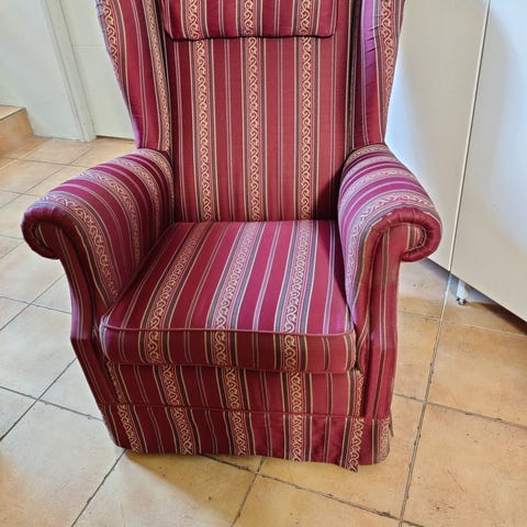 Puinen nojatuoli. Kankaassa muutama tahra. Suomalainen design, Arktis.