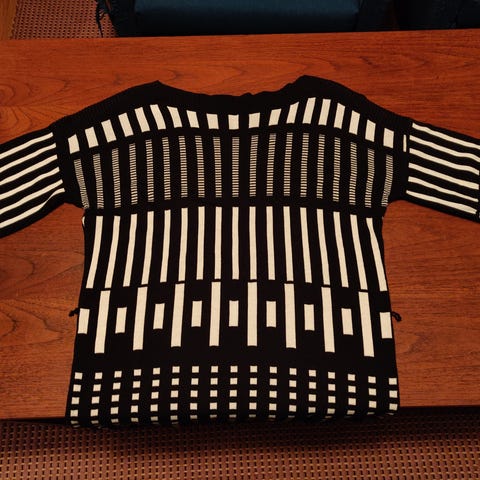 Kivat resorit tuovat neuleelle tyylikkyyttä. Jacquard-neulos on käännetty tuotteessa nurinpäin. Vaikka tämä ei ole kaksipuoleiseen kättöön tarkoitettu pusero, on kuvio hieno myös nurinpäin ja halutessaan tätä voisi käyttää niinkin, jos poistaa laput. Siistit saumat.
