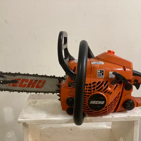 Muuten toimiva saha paitsi kaasun liipasinlanka poikki ja kahvan värinänvaimennuskumipuslat tiensä päässä.