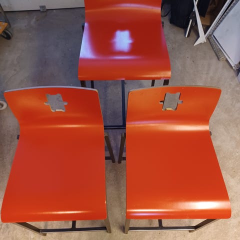 Kolme punaista puista tuolia. Tuolit ovat matalia, istuinkorkeus 50 cm ja soveltuvat esimerkiksi lasten käyttöön tai terassille. Hinta 20 €/kpl