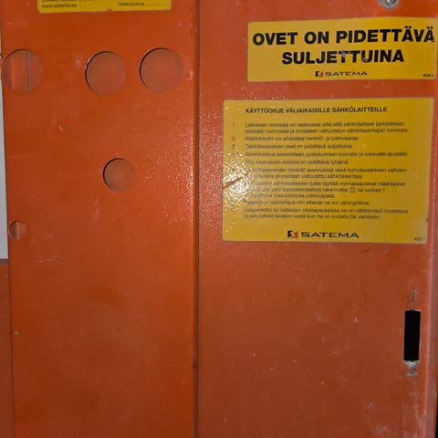 125 A pääsulakkeilla oleva työmaakeskus. Yksi luukun nurkka lohjennut. Syöttökaapelikieppi alumiinijohtimilla mukaan.