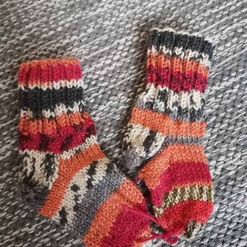Vaaleanpunaiset neulotut villasukat. Jalkaterän pituus noin 12cm. Käytetyt, hieman tummentumaa ja venymää suuaukolla.