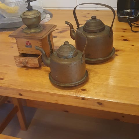 Kuvien esineet, kahvipannu 20€, hinkit (18 korkeus ja 16 leveys) 10€ kpl, siivilä mustakahva 3€, pieni muki 2€ ja pitkä kahva valkoinen siiviläkauha 7€. Tai kaikki yhteensä 40€.