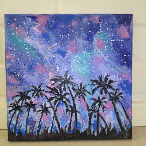 Akryylimaalaus nimeltä Tähtisumu, myyjän maalaama ja signeeraama. Rautalankaripustus.