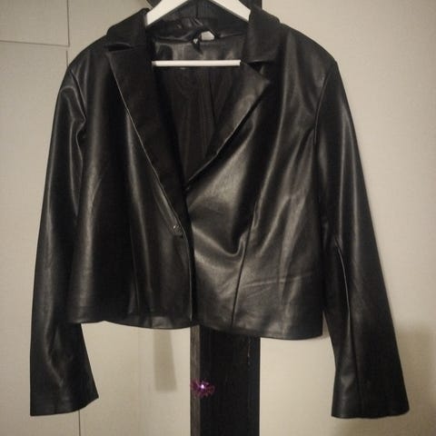 Lyhyt tyylikäs keinonahkatakki takki,koristevyöllä ja taskuilla. Sopii hyvin yhteen mekonkin kanssa. Voin lähettää.Lisään 7 e postikuluja.