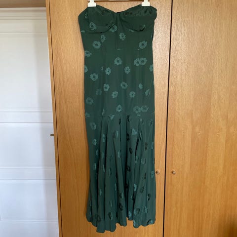 Superihana laskeutuva, pehmeä ja juhlava materiaali. Edessä puolikas nappilista. Tällä mekolla voi mennä iltajuhlaan tai sitä voi pitää myös kotiasuna.