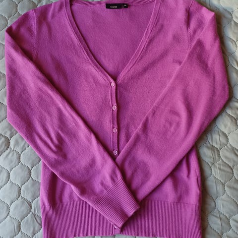 Kaunis uudenveroinen fransa neuletakki on hempeän vaaleanpunainen.