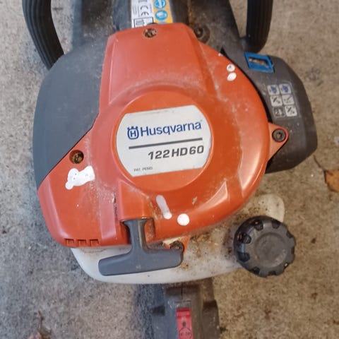 Hyvässä kunnossa oleva Husku, jossa on pitkä leikkuuterä. Öljyämistä vailla oleva, mutta Täysin toimiva leikkuri.