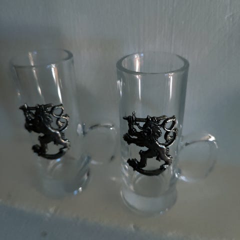 Leijona snapsilasit tinajalalla. Lahjalaatikko.