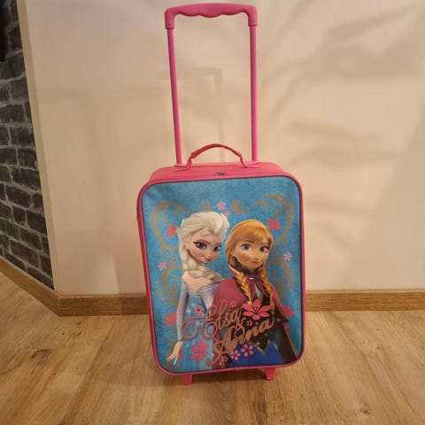 Disney Frozen matkalaukku, valmistettu muovista. Väri sininen, unisex-malli. Laukussa on vetokahva ja pyörät, sisätilat sisältävät verkko-osaston ja kiinnityshihnat. Soveltuu lasten tai nuorten käyttöön.