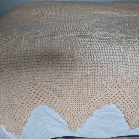 Pitsinen käsin virkattu sängynpeitto. Luonnonvalkoinen/vaalea beige. Yksi likatahra (kuvassa). Säilytetty vuosia kaapissa,joten vaatii tuuletuksen.Kulkeutuu tarvittaessa Helsinkiin marraskuun loppupuolella.