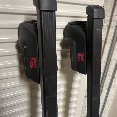 Mont Blanc säädettävät taakkatelineet, 123 cm putki, sopii useimpiin autoihin, joissa perinteiset kattokaiteet. Itsellä nämä Skoda Octavia farmarissa, 2015. MontBlanc tarjoaa tukevan ja kestävän ratkaisun kuljetustarpeisiin. Telineisiin myös lukot ja näihin sopivat avaimet (kuva 5).