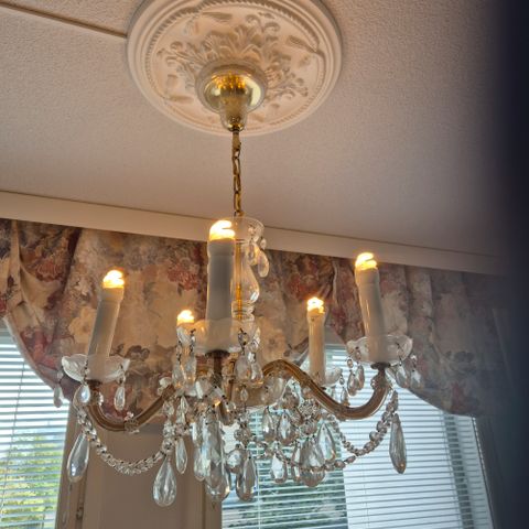 Upea kattokruunu kahdeksalla lampulla. Kattokruunun voi kytkä niin että palaa 8 lamppua tai 4 lamppua. Kattokruunu myydään ilman varjostimia. Kuvien varjostimet myydään hintaan 2,50€/kpl. Viimeisen kuvan seinälampetit myydään hintaan 20€/kpl
