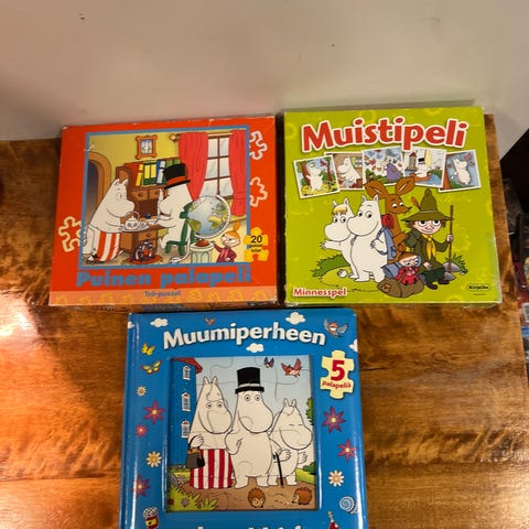 Moomin Story Cubes lautapeli, sisältää kuusisivuiset kuutiot, joissa on erilaisia kuvia Muumi-teemalla. Pelissä käytetään kuutioita tarinankerrontaan ja luovuuden kehittämiseen. Sopii eri-ikäisille pelaajille.