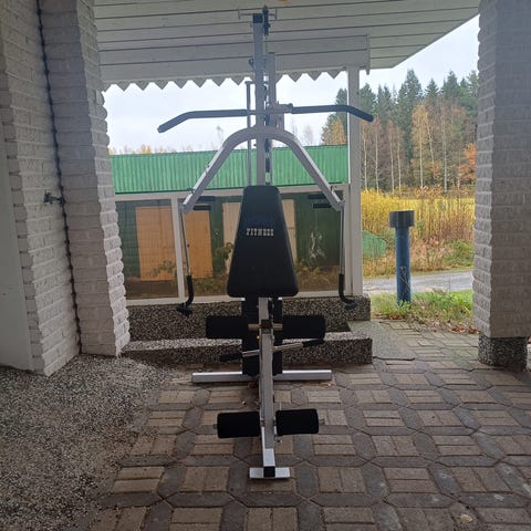 Valkoinen kuntoilulaite/kotikuntosali/kuntolaite/kuntolukeskus. 70kg painopakka. Autetaan nostamaan kyytiin. 216korkee 185pitkä