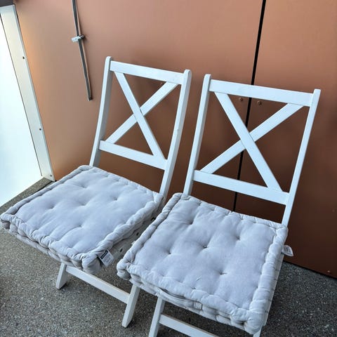 Myydään Ulkokalustesetti (pöytä/2 tuolia), vaaleanruskeaksi petsattu .Pehmusteet