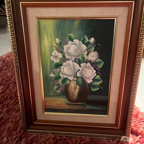 Taulu, jossa on valkoisia kukkia ja vihreitä lehtiä Tarjoa