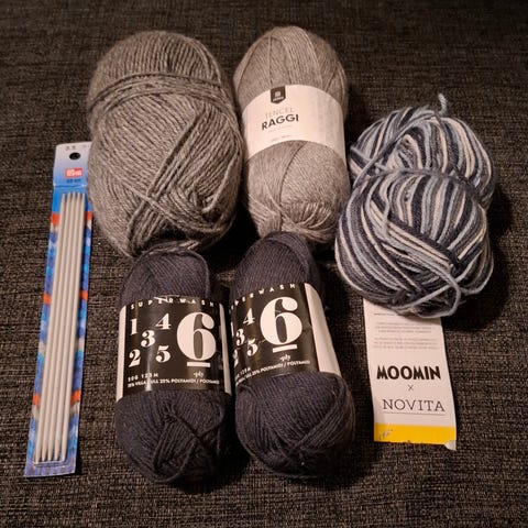 Markus 8 ply ( väri Brilliant white, lähinnä luonnonvalkoinen) ja 60 g Fazer Lontoonrae 7 veljestä.